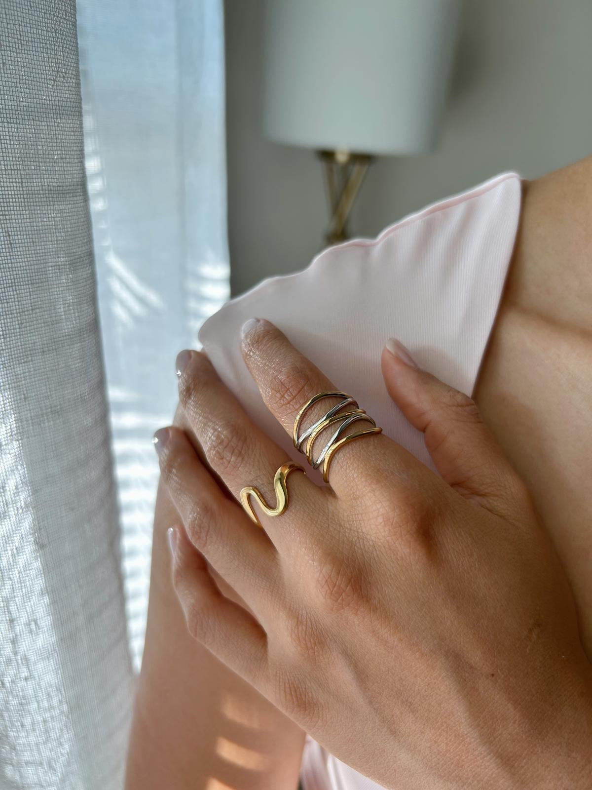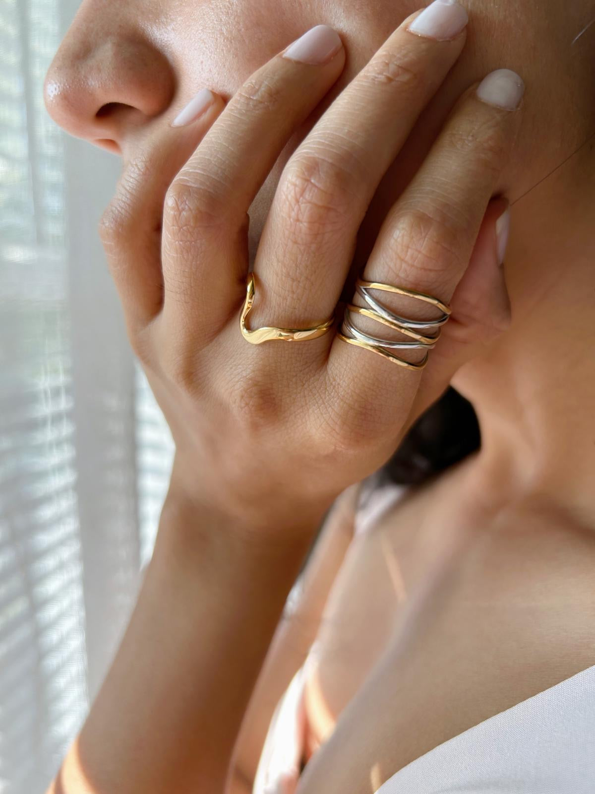 This two-tone geometric ring blends the best of both worlds—sleek gold and silver tones in a striking yet minimal design. Its clean lines and contemporary silhouette make it a standout piece for those who love refined, modern jewelry.